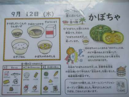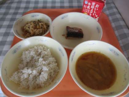 麦ごはん、牛乳、さばのつけ焼き、切干大根の三杯酢、かぼちゃのみそ汁