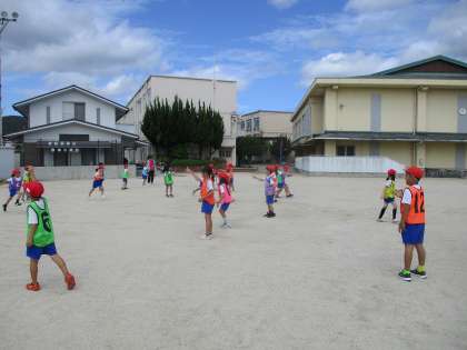 「ジャンケンとびあそび」「島とび」「川とび」…と、いろいろな遊び方をしました。中学年の「はばとび」につながるように、片足でジャンプしたり、両足でとまったりする動きを遊びの中に取り入れてみました。遠くにも、上手に跳ぶことができました。