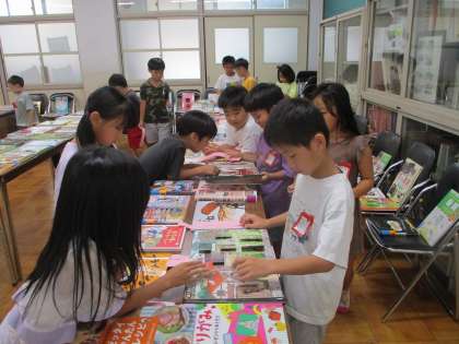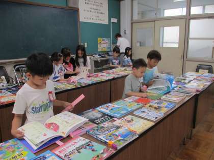 会議室にずらっと並んだ、たくさんの本に感動でいっぱいの子どもたち。表紙を見て、読みたい本を見つけたら、中を開いて少し読んでみました。時間が足りないくらい、夢中になっていました。選んだ本が図書館に入るといいですね!