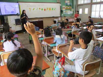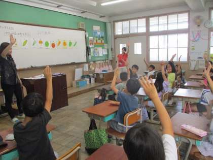 新しいALTの先生と授業をしました。自己紹介では、出身地や趣味・特技などのお話を興味をもって聞いていました。「サラダで元気」の学習では、いろいろな野菜の言い方を知り、ポインティングゲームを楽しみました。
