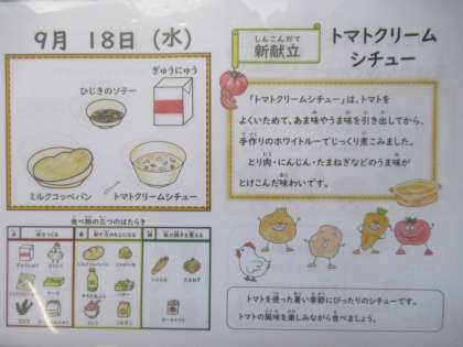 ミルクコッペパン、牛乳、トマトクリームシチュー、ひじきのソテー