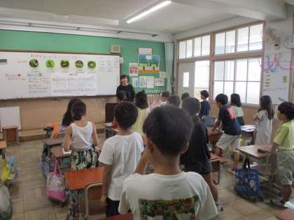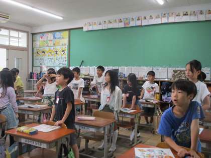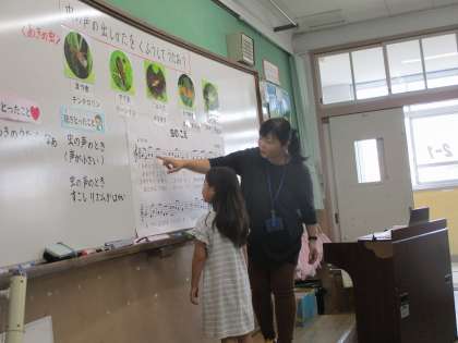 音楽科「リズムをかさねて楽しもう」の学習では、「いるかはざんぶらこは、何拍子かな?」と確かめながら、リズム打ちをしたり、打楽器で演奏したりすることを楽しみました。
