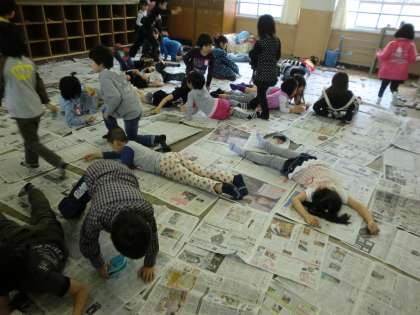 まず、教室一面に紙をしきつめました。