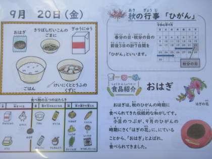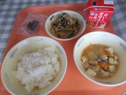 ごはん、牛乳、鶏肉ととうふのくず煮、切干大根のごま煮、おはぎ