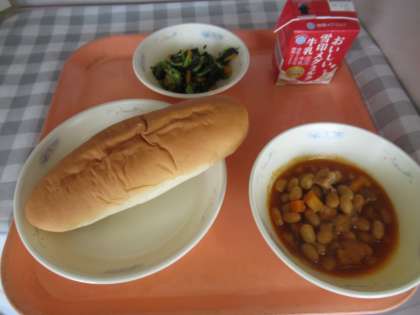 味つけコッペパン、牛乳、ポークビーンズ、小松菜のソテー