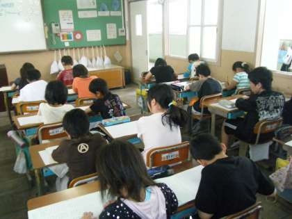 朝学習の『視写』をしている様子です。お手本の詩を見ながら,ゆっくりと丁寧に写しています。写真で伝わるかどうか分かりませんが,程よい緊張感が教室に流れています。後で提出された視写プリントを丸つけをすると「みんなめっちゃきれいな字!」と担任は感動していました。