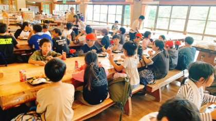 昼食はからあげ弁当です。食堂で食べています。