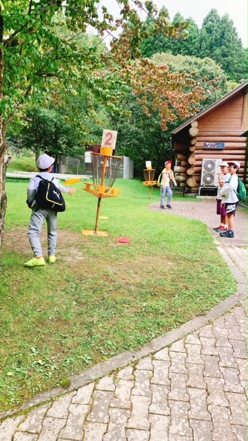 フライングディスクゴルフに取り組んでいます。順番にディスクを投げ、できるだけ少ない投数で目標となるポイントに入れることを競います。
