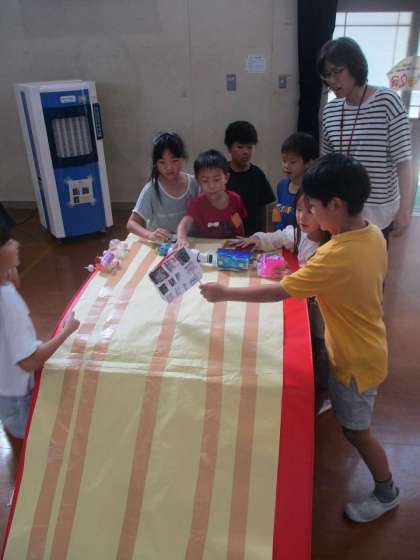 「ポケモンゲットまとあて」「ひみつのえんそうかい」「ポケモンボーリングわなげ」「たのしくジャンプチャレンジ」「はしれ!カーレース!」「いろいろめいろ」「カーレース&紙コップダンス」「しんかい魚キングダム」「むげんループめいろ」「スーパーはりてずもう」「ぴょんぴょんシュートゲーム」「わくわくしゃてき」「ぐんぐんロケット」のお店を作りました。