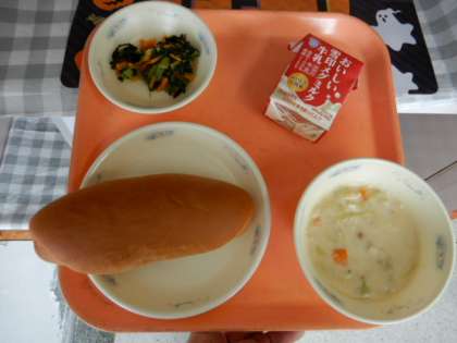 黒糖コッペパン、牛乳、キャベツの米粉クリーム煮、小松菜のソテー