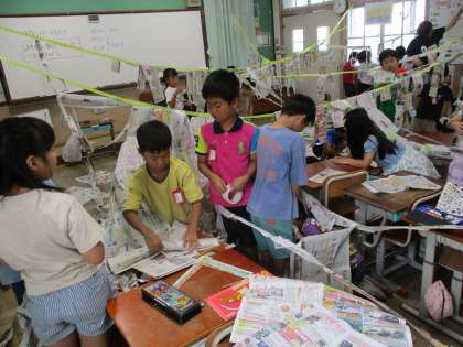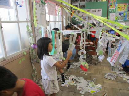 紙をどんどんつないだり、つるしたりしながら、紙の切り方や長さ、方向などを工夫を見つけることができました。