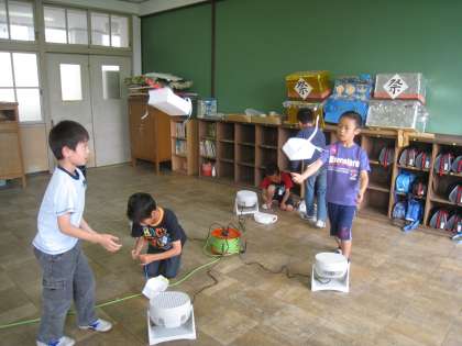下敷きであおいでもなかなかうまく浮かないので,送風機を使って風を送りました。