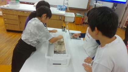 今日は流れる水のはたらきを調べるための実験を行いました。