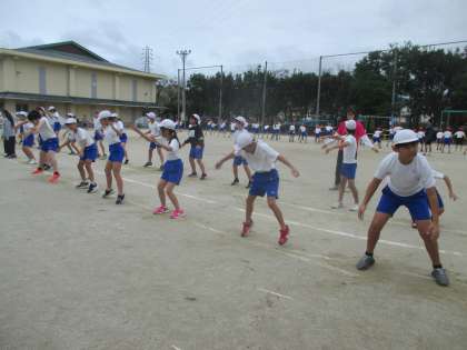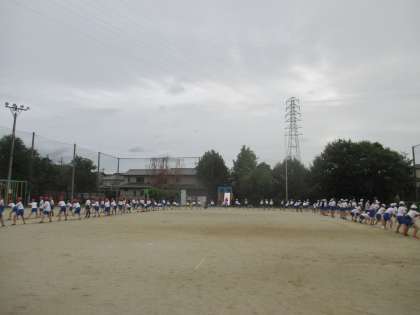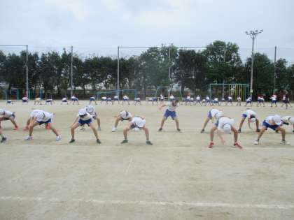 初めて外での取組です。移動隊形や立ち位置を確認しました。体育館とは違う雰囲気で、一生懸命頑張りました。