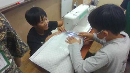 家庭科では、ミシンを使ってトートバッグを作っています。教え合いながら活動しています。