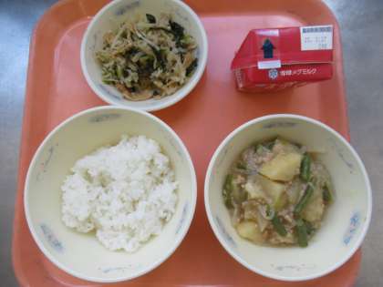 ごはん、牛乳、じゃがいものそぼろ煮、切干大根の煮つけ