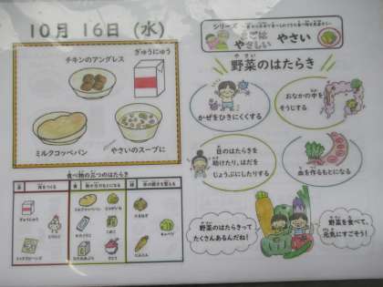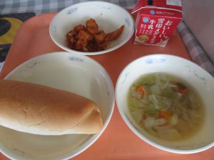 ミルクコッペパン、牛乳、チキンのアングレス、野菜のスープ煮
