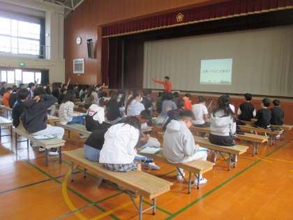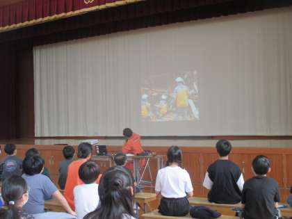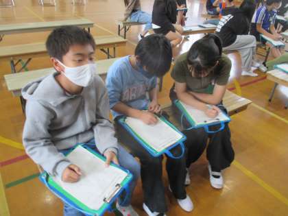6年生は、総合的な学習の授業で「災害から身を守る」をテーマに学習をしています。調べていく中で、「もしも自分たちの地域で災害が起こったらどうすればいいんだろう」という疑問が出てきました。その疑問を解決するため、消防署の方に話を聞きたい!という子どもたちの声に応えて、右京消防署(梅津出張所)の方が来校してくださいました。一生懸命メモを取りながら、聞く姿がありました。