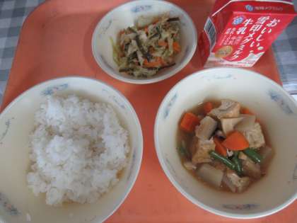 ごはん、牛乳、厚あげのふきよせ煮、ごま酢煮