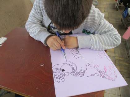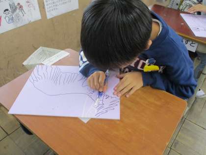 版画の学習では、彫刻刀を使って板を彫っています。みんな緊張をしながら一生懸命に集中して彫り進めていました。