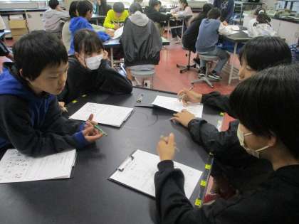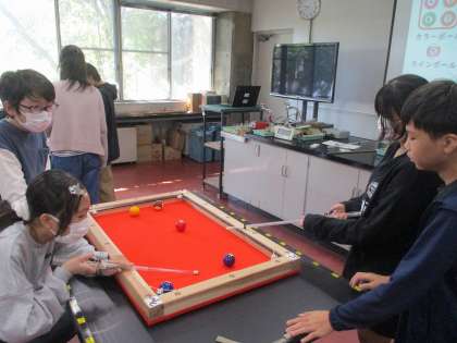 科学センターに行ってきました。1組は物理で『しょうとつのエキスパートになろう』という学習をしました。しょうとつの実験を繰り返し、データをとって最後にはビリヤード対決をしました。
