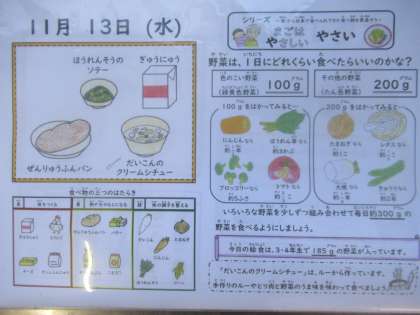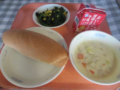 全粒粉パン、牛乳、だいこんのクリームシチュー、ほうれん草のソテー