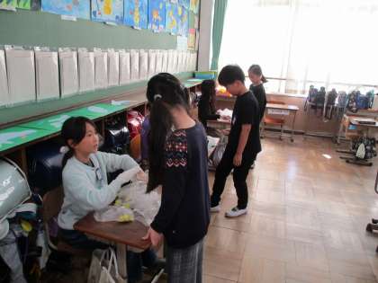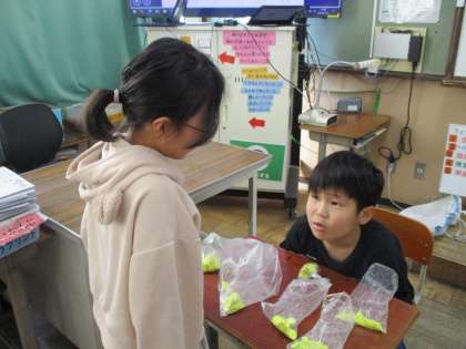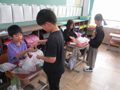 外国語活動でカードづくりをしています。自分の作りたいカードのイメージから欲しい形や色を英語で言ってもらいながら、カードづくりを進めました。