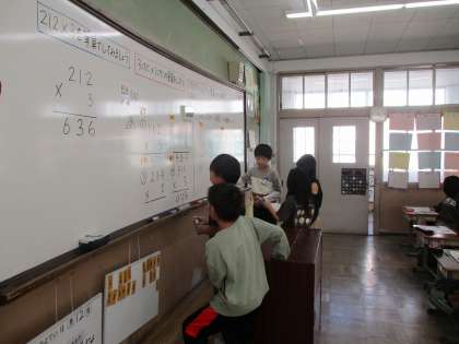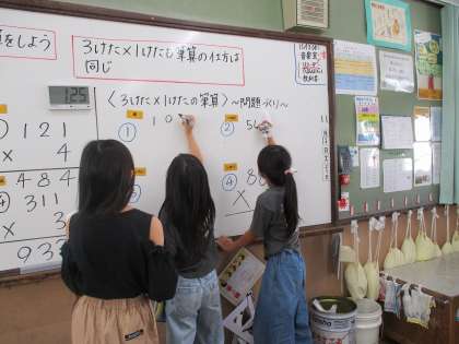 2けた×2けたや3けた×1けたの筆算に取り組んでいます。かけ算の筆算をどのようにしたらいいか考えながら分かりやすい説明を考えていました。またたくさんの練習問題や問題作りに取り組みました。