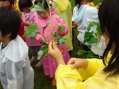 さつまいもの苗を植えました。学校の緑の広場の学年園で一人ひとりが,さつまいもの苗を植えました。畑のうねづくりから植え方まで社会福祉協議会の皆様から教えていただきました。