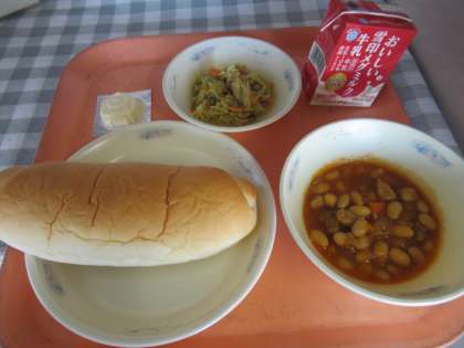 味つけコッペパン、牛乳、ポークビーンズ、ツナともやしのカレーソテー、チーズ