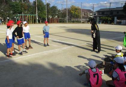 同じ時間にグラウンドで2年生が縄跳びの学習をしていたので、5年生が「8の字跳び」の見本をしました。