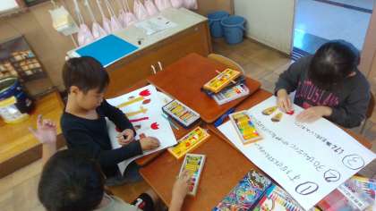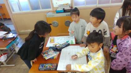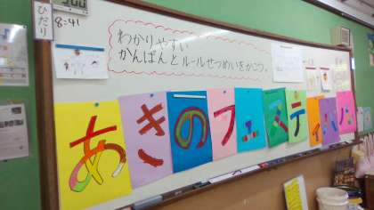 11月28日にせまった「あきのフェスティバル」にむけて、今日は看板やルールを書きました。たくさんのお客さんに来てもらいたいという思いをもって、一生懸命書く姿が見られました。