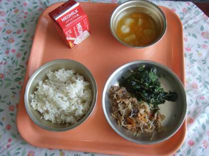 麦ごはん 牛乳 豚肉とこんにゃくのいため煮 ほうれん草とじゃこのいためもの フルーツ白玉