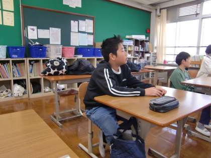 梅津中学校の授業体験に行きました。外国語の学習で名前と好きな物を伝えて自己紹介をしたり、クイズに答えたり、たくさん手を挙げて積極的に参加していました。