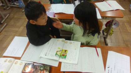 学習の最後には、友だちとお話をして、自分で物語を作ります。