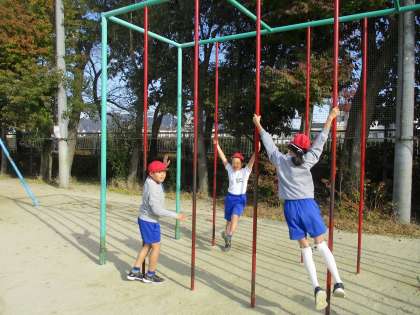 体育の時間に総合遊具やうんていなどの運動場にあるようぐを使って体をほぐしました。