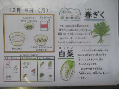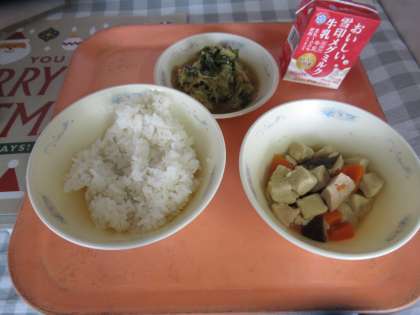 麦ごはん、牛乳、高野どうふと野菜の炊き合わせ、春菊とはくさいのごま煮