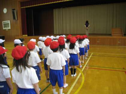 男女混合の背の順に並んで,先生のお話を聞く時の姿勢を学びました。