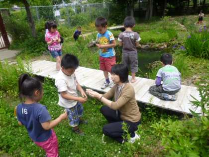 しろつめぐさでゆびわを作ったり,おおばこですもうをしたり,からすのえんどうで笛を作ったりしました。はだしになって草の上を走っている児童や,草の上に寝転んで「いい気持ち」と言っている児童もいました。