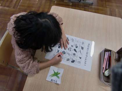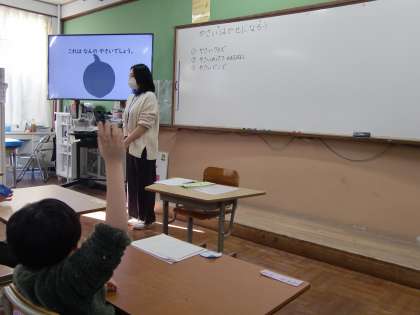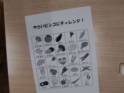 栄養教諭の先生から野菜のことについてたくさん教えてもらいました。野菜のシルエットクイズをしたり、野菜ビンゴをしたり、野菜の名前や野菜のパワーについて知ることができました。