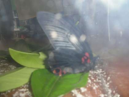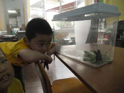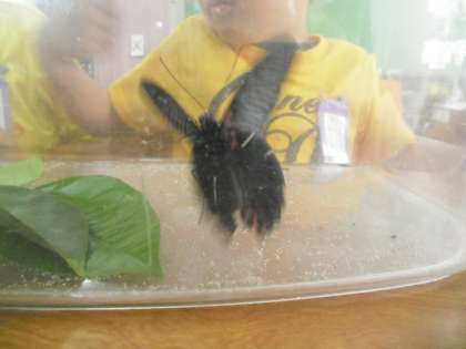 16日(水)の給食中、教室にクロアゲハが舞いこんできました。虫大好きコンビの1年生と5年生の二人は、大喜びで大興奮でした。キャベツのホットマリネも大豆と牛肉のトマト煮もなかなか口に入らず、ひたすら「すご〜い!!」「去年より大きいわ。」「卵、産むかなぁ…」とおしゃべりに花が咲いていました。