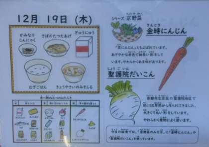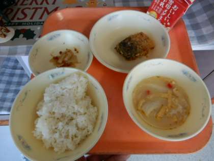 麦ごはん、牛乳、さばのたつたあげ、かみなりこんにゃく、京野菜のみそ汁