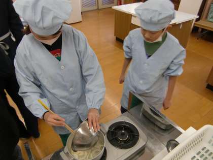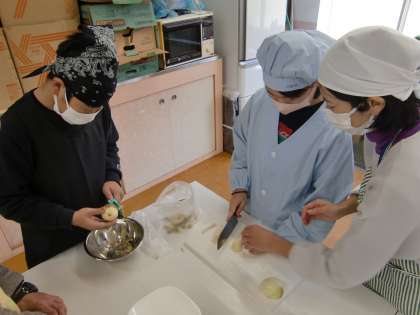 クッキングでぎょうざピザ、みそ汁を作りました。ぎょうざの皮に自分が食べたい具材をのせ、フライパンで焼きました。どんなピザにするのかワクワクしながら作っていました。みそ汁は畑で育てた水菜とねぎを入れました。「おいしい!!」ととっても満足そうに食べていました。