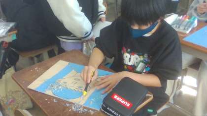 図工の授業で版画に取り組んでいます。一生懸命彫った版を協力して刷りました。次はいよいよ色付けです。