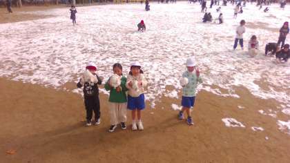 休み時間には運動場に出て、雪だるまや雪の玉を作って楽しんでいた子どもたち。