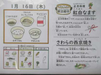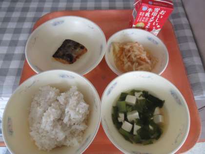 麦ごはん、牛乳、さわらの西京焼き、紅白なます、すまし汁