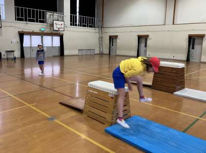 3組の体育では、とび箱に取り組んでいます。自分の目標に向かって頑張っています。