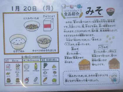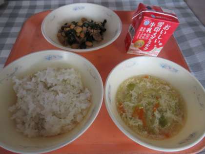 麦ごはん、牛乳、肉みそいため、キャベツのかきたま汁