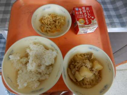 麦ごはん、牛乳、肉じゃが(ピリカラみそ味)、切干大根