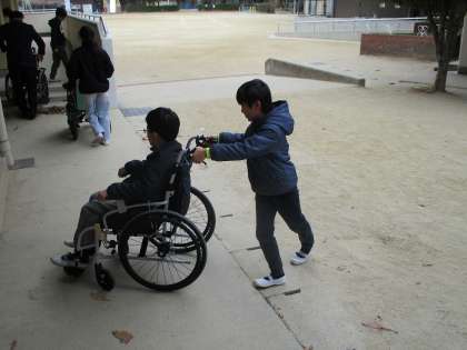車いす体験・アイマスク体験をしました。体験を通して初めてわかることや気づくこと、感じたことをこれからの学習へとつなげていきます。
